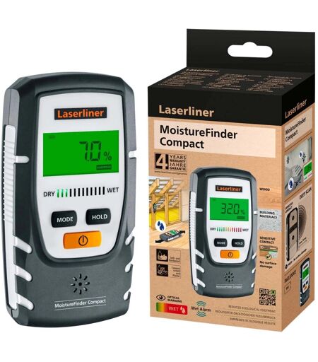 Questo misuratore di umidità del materiale consente di misurare l`umidità di legno e materiali da costruzione senza danneggiarli. Il dispositivo ha quattro curve caratteristiche del materiale selezionabili per i tipologia di legno morbida (ad es. abete rosso, pino), i tipologie di legno duro (ad es. faggio, quercia), intonaco di gesso e massetto di cemento. L`indicatore bagnato-asciutto utilizza tre LED a colori per indicare immediatamente il grado di umidità o di essiccazione dell`oggetto da controllare. Se viene rilevato del materiale bagnato, l`utilizzatore viene avvertito da un segnale acustico supplementare. La funzione Hold consente di fermare sul display l`ultimo valore di misurazione premendo un pulsante. Dopo circa tre minuti di inutilizzo si verifica lo spegnimento automatico. ...