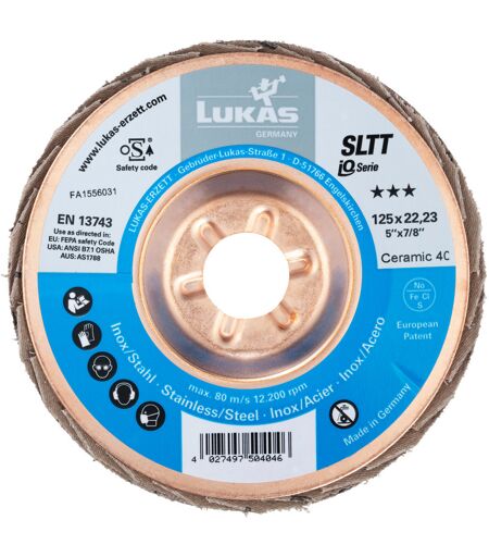 LUKAS - Disco abrasivo lamellare SLTT (CER), piatto-obliquo per INOX ⌀ 115 mm