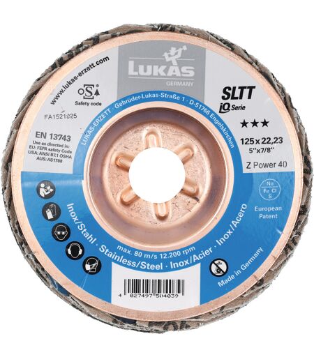 LUKAS - Disco abrasivo lamellare SLTT (ZA-Power), piatto-obliquo per acciaio e INOX ⌀ 125 mm