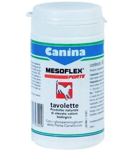 DRN Mesoflex Forte è un coadiuvante per tutte le forme di degenerazione del tessuto cartilagineo ed osseo. Principio Attivo: 1 kg = perna canaliculus, gelatina, alghe marine, lievito di birra, metionina, vitamina E/selenio; prolina 50 mg, glicina 50 mg, lisina 55 mg, metionina 30 mg, arginina 45 mg, tirosina 10 mg, treonina 20 mg, alanina 40 mg, cistina 7 mg, leucina 40 mg, valina 40 mg, triptofano 6 mg, fenilanina 40 mg, taurina 8 mg, istidina 20 mg, serina 28 mg, isoleucina 20 mg, acido glutammico 40 mg, acido aspartico 40 mg, condroitin solfato 4-6 12 mg, eparan solfato 10 mg, cheratan solfato 6 mg, acido ialuronico 6 mg, dermatan solfato 6 mg, calcio 9 mg, sodio 12 mg, potassio 12 mg, zolfo 7 mg, zinco 5 mg, magnesio 2 mg, manganese 10 mcg, selenio 12 mcg, iodio 180 mcg, ferro 200 mcg; vit. E d,alpha-tocoferolo acetato 10 mg, vit. C acido ascorbico 4 mg, vit. B1 50 mcg, vit. B2 55 mcg, vit. B6 mcg, vit. PP 105 mcg, acido pantotenico 65 mcg; EPA 6 mg, DHA 4,15 mg. Indicazioni: ...