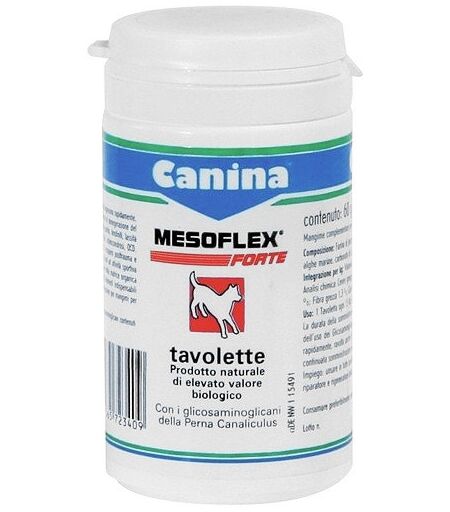 Mesoflex Forte Coadiuvante per tutte le forme di degenerazione del tessuto cartilagineo ed osseo; artrosi, displasia dell'anca e del gomito, tendiniti, lassità legamentosa, spondilosi, compressione delle vertebre cervicali, osteocondrosi, OCD, difficoltà nel portamento del padiglione auricolare, recupero post-trauma e/o port-operatorio; protezione delle capsule sinoviali da sforzi per attività sportiva particolarmente intensa; partecipa al processo di rigenerazione della matrice organica della cartilagine fornendo all'organismo tutti quegli elementi indispensabili alla realizzazione del processo rigenerativo. Modalità d'uso 1 misurino (2 g) o 1 tavoletta ogni 15 kg di peso al dì. Componenti Principio Attivo: 1 kg = perna canaliculus, gelatina, alghe marine, lievito di birra, metionina, vitamina E/selenio; prolina 50 mg, glicina 50 mg, lisina 55 mg, metionina 30 mg, arginina 45 mg, tirosina 10 mg, treonina 20 mg, alanina 40 mg, cistina 7 mg, leucina 40 mg, valina 40 mg, ...