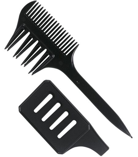 Pettine a stringa con sagoma Applicazione: Posizionare lo stencil sul pettine per fili.Applicare il colore / candeggina agli spazi tra le cioccheRimuovere lo stencilUsare la punta del pettine per sezionare la passe e pettinarla con il lato a denti fini.pettinare il prodotto di colore nei capelli con il lato ruvido del pettine ...