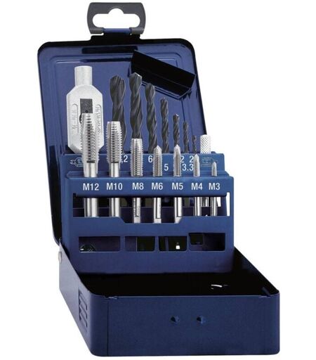 Dettagli tecnici Materiale punte HSS Norma DIN DIN 352 Senso di rotazione del filetto Taglio destrorso Tipo filettatura metrica Incluso nella consegna Maschi per filettare: M3, M4, M5, M6, M8, M10, M12 Giramaschio 1 1/2 Punta di foratura Ø 2,5, 3,3, 4.2, 5.0, 6.8, 8.5, 10,2 mm. Testo tradotto automaticamente. Requisiti di sistema null ...