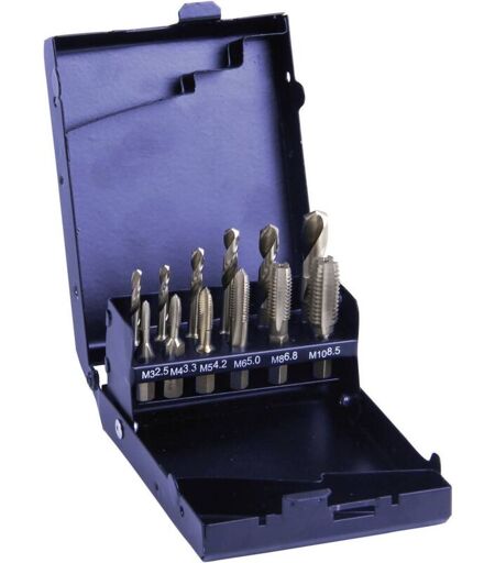 Dettagli tecnici Materiale punte HSS Senso di rotazione del filetto Taglio destrorso Tipo filettatura metrica Maschio per filettare kit inserti 12 pz. incl. Kit punte a spirale Con questo grande assortimento sono per tutte le modifiche in metallo. Contiene tutto ciò di cui avete bisogno. filettatura nell'area Praticare i core corrispondente forare, tagliare quindi di una filettatura interna o anche filettatura esterna e abbassare e sbavare. Testo tradotto automaticamente. Incluso nella consegna Maschio per incisione HSS bit M3/M4/M5/M6/M8/M10 Bit trapano elicoidale HSS Ø 2,5/3,3/4,2/5,0/6,8/8,5 mm. Requisiti di sistema null ...