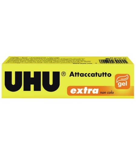 UHU Attaccatutto universale Extra, eccezionale adesivo gel a base di resina sintetica per incollaggi rapidi e cristallini. La formula in gel assicura incollaggi puliti ed antigoccia ed è ideale per l’uso su superfici verticali. Non increspa la carta. ...