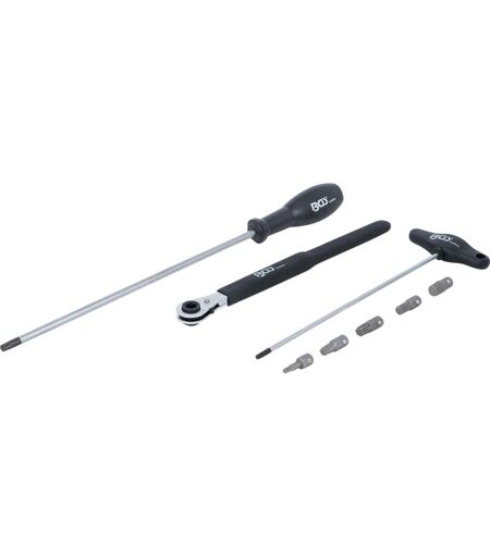 Appositamente concepito per lavori alla cerniera della porta di VW/Mercedes-Benz/Porsche/Audi Oggetto della fornitura: 1 cacciavite T30 (lunghezza 360 mm) 1 cacciavite con impugnatura a T T 20 (lunghezza 240 mm) 1 cricchetto reversibile (lunghezza 240 mm) 5 inserti con profili T40 - T45, poligonale interno M4 - M8 - M10 Imballaggio adatto per essere appeso alla parete Ja Peso del tessuto 0.41 Dimensioni dell'imballaggio 1 Peso lordo 410 g ...