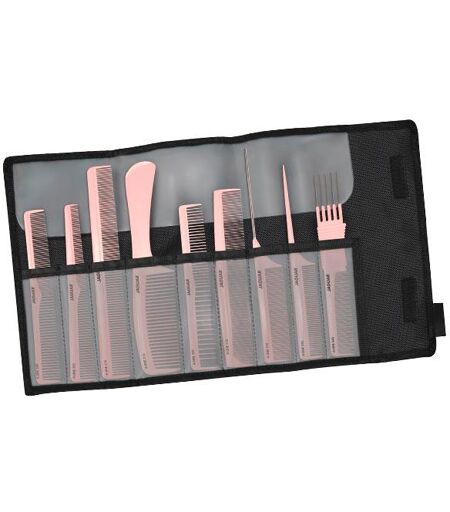 Il set di pettini è composto da 9 modelli in una custodia attraente e pratica. ionicorifinito a manoantistaticoresistente ai prodotti chimiciantibatterico ...