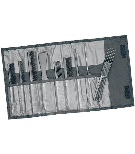 Il set di pettini è composto da 9 modelli in una custodia attraente e pratica. ionicorifinito a manoantistaticoresistente ai prodotti chimiciantibatterico ...