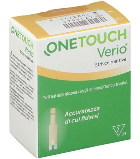 Onetouch® Verio® Dispositivo medico CE. Le strisce reattive vengono utilizzate con gli strumenti OneTouch Verio IQ e OneTouch Verio Pro per la misurazione quantitativa dei livelli di glucosio nel sangue capillare fresco intero. Caratteristiche: Le strisce aspirano automaticamente una piccola quantità di sangue. È facile applicare il sangue ad uno dei due lati della striscia reattiva OneTouch Verio. I sistemi OneTouch Verio Pro e OneTouch Verio IQ forniscono risultati plasmacalibrati che consentono un facile confronto con le analisi di laboratorio. Modo d'uso: Inserire una striscia reattiva OneTouch Verio® nell'apposita porta con il lato dorato della striscia reattiva e i due denti in argento rivolti verso il glucometro. Conservazione: Conservare il flacone in un luogo fresco e asciutto a temperature inferiori ai 30°C. Non refrigerare. Tenere lontano da fonti di calore e dalla luce solare diretta. Conservare le strisce reattive esclusivamente nel loro flacone originale. Per evitare danni o contaminazione, non trasferire le strisce reattive in altri contenitori. ...