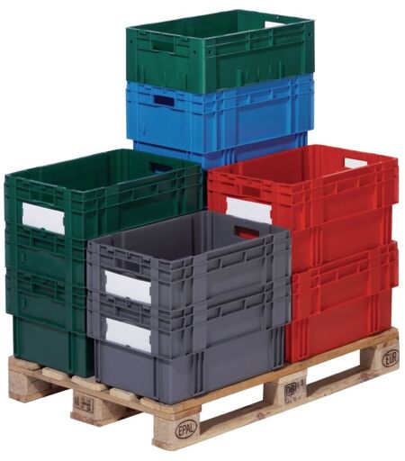 Realizzato in polipropilene · fondo rinforzato con nervature per un'elevata capacità di carico · capacità di carico in pila circa 500 kg · adatto per nastri trasportatori · con manico passante sulla faccia anteriore · con supporto per documenti · chiusura del coperchio possibile tramite sigilli (accessorio) · approvato per alimenti · resistente alle temperature da -20 a +90 °C · resistente a oli, grassi e alla maggior parte di acidi e basi · pareti laterali e fondo chiusi, impilabili uno dentro l'altro e sovrapposti ...