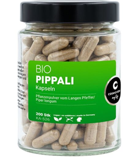 Capsule a base di erbe Pepe lungo BIO - supporto ayurvedico per il corpo. Il Pippali (Piper longum) o pepe lungo è una pianta rampicante esile e aromatica con radici legnose perenni. Le foglie e i frutti sono di colore nero-verde. Frutti e radici maturi e immaturi vengono utilizzati nella dieta ayurvedica. Le capsule Cosmoveda contengono la polvere dei frutti di pepe lungo (pippali) che viene macinata dolcemente e finemente al di sotto dei 40°C e proviene dalle zone biologiche dell'India e dello Sri Lanka. Inoltre, contiene polifenoli (sostanze fitochimiche bioattive), che formano il carattere dosha* delle piante sotto forma di colori, aromi e tannini. I fiori di pepe nero hanno molte caratteristiche positive: contribuiscono al mantenimento del sistema immunitario e delle difese naturali, supportano il funzionamento dei polmoni, supportano la digestione. La dose giornaliera contiene 3,3 g di polvere vegetale, di cui 26 mg sono polifenoli. Secondo la tradizione ayurvedica il prodotto regola l'equilibrio armonico dei dosha* bilanciando 6 sapori. Il pepe lungo offre un gusto piccante Effetto ayurvedico: Vata- Pitta + Kapha- Nome latino: Piper longum Nome inglese: Long pepper Altri nomi: Indian long pepper, pipli *Dosha (vata, pitta e kapha) sono principi ayurvedici che non hanno un vero e proprio equivalente nella scienza moderna. Le capsule a base di erbe BIO della marca Cosmoveda sono vegane, senza lattosio e senza glutine. La massima qualità è garantita dalla produzione biologica e dal commercio equo (Fair Trade). Il prodotto è un integratore alimentare. ...