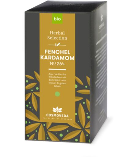 Combinazione aromatica di finocchio e cardamomo - per le persone di temperamento. Il finocchio (Foeniculum vulgare) dalla famiglia delle Apiaceae (Ombrellifere) proviene dall'Europa meridionale. Cresce al meglio in un ambiente submediterraneo e può crescere fino a 2 metri. È popolare principalmente per i suoi semi aromatici. Cardamomo (Elettaria cardamomum) è una delle spezie più antiche e preziose del mondo. Proviene dall'India. È un'aggiunta comune a caffè, macedonie e pasticcini ed è ottimo anche per il tè. Per ancora più sapore, vengono aggiunti corteccia di cannella, radice di liquirizia e anice stellato. I tè BIO del marchio Cosmoveda sono vegani, senza lattosio e glutine. Le erbe vengono tritate grossolanamente, senza additivi aromatici e confezionate in confezioni naturali (bustina di amido di mais, senza spago e slip). La massima qualità è garantita dalla produzione biologica e dal commercio equo e solidale (Fair Trade). Per una cucina e dieta ayurvedica equilibrata. ...