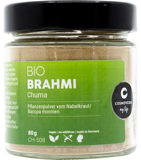 Polvere di erbe della pianta Brahmi - »Cibo per la mente« ayurvedico . Brahmi è una lussureggiante pianta rampicante verde, che cresce fino a 40 cm e prospera principalmente nelle aree umide e paludose. È riconoscibile per le sue piccole foglie e fiori bianchi. Le parti fuori terra della pianta sono più comunemente utilizzate nella dieta ayurvedica, ma anche la radice, steli e foglie. Nell'Ayurveda, il brahmi è molto apprezzato ed è anche chiamato »erba di tutte le erbe« per le sue eccezionali proprietà. Brahmi contribuisce anche alla normale circolazione sanguigna, che è correlata alla funzione cerebrale. Cosmoveda Churna contiene polvere di brahmi, che viene macinata delicatamente e finemente sotto i 40°C e proviene dalle regioni ecologiche dell’India e dello Sri Lanka. Massima qualità del prodotto: Da produzione biologica Senza glutine Senza lattosio Vegano Fresco (sotto i 40°C) Dal commercio equo e solidale (Fair Trade) La dose giornaliera (2 g) contiene 36 mg di polifenoli. Secondo la tradizione ayurvedica, il prodotto regola l’equilibrio armonico dei dosha* bilanciando 6 sapori. Brahmi offre un sapore amaro e astringente. Effetto ayurvedico: Vata= Pitta= Kapha= Ama- Nome latino: Bacopa Monnieri Nome inglese: Thyme Leaved Gratiola, Indian Pennywort Altri nomi: Sarswati, Mandook parni *I dosha (vata, pitta e kapha) sono principi ayurvedici che non hanno un equivalente nella scienza moderna. Il prodotto è un integratore alimentare. ...