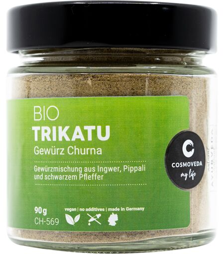 Polvere a base di erbe Trikatu per sostenere l'agni ovvero il fuoco digestivo nel corpo. Trikatu è una parola sanscrita, che significa »tre spezie«. È una miscela tradizionale di tre spezie in proporzioni uguali: zenzero, pepe nero e pepe lungo. Trikatu è usato in Ayurveda per promuovere l'agni. Agni è il fuoco biologico che controlla il metabolismo. Il consumo di questa preparazione ayurvedica aumenta la produzione di calore nel corpo e di conseguenza aumenta la produzione di succhi digestivi. Cosmoveda Churna contiene polvere di radice di zenzero e frutti di pepe nero e lungo ed estratto di radice di zenzero. Gli ingredienti provengono dalle aree biologiche dell'India e dello Sri Lanka. Massima qualità del prodotto: Da produzione biologica Senza glutine Senza lattosio Vegano Dal commercio equo e solidale (Fair Trade) Tre spezie piccanti ardenti: zenzero, pepe lungo e pepe nero . Secondo la tradizione ayurvedica, il prodotto regola l'equilibrio armonico dei dosha bilanciando 6 sapori. Trikatu offre un gusto deciso. Effetto ayurvedico: Vata- Pitta+ Kapha- Ama- Nome latino: Piper nigrum, Piper longum, Zingiber officinalis Nome inglese: Trikatu (Black Pepper, Long Pepper and Ginger) Altri nomi: Katutraya, Three peppers ...
