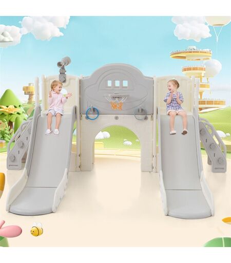 Presentazione del nostro gioco scivolo 8 in 1, l’avventura definitiva per i bambini in giardino! Questo set completo è ricco di funzionalità interessanti che stimoleranno l’immaginazione e intratterranno i più piccoli per ore. Con due scivoli emozionanti, una scala da arrampicata stimolante, una piattaforma spaziosa, un gioco del lazo coinvolgente, pratici scomparti per riporre, un binocolo per esplorare e persino un canestro da basket per una competizione amichevole, il divertimento non finisce mai. La sicurezza è la nostra assoluta priorità e si riflette in un design morbido e sicuro con scivoli più lunghi, zone tampone più ampie e corrimano rialzati per garantire la tranquillità dei genitori. La sicurezza e il benessere dei vostri bambini sono la massima priorità con questo set di scivoli realizzato con materiali non tossici certificati EN71. Grazie a un montaggio semplice e a una facile pulizia, i genitori trascorreranno meno tempo a montare e mantenere il gioco e più tempo a ...