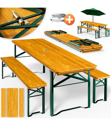 Set da birreria in legno- pieghevole con montaggio rapido! Fino a 8 persone possono sedersi sull'accogliente set da birra di CASARIA. Il set è composto da 2 panche e un grande tavolo. Così sarete sempre ben preparati per una festa spontanea. Il set di panche e tavolo è molto facile da montare e smontare. I piedini pieghevoli consentono di riporre il tutto in modo da risparmiare spazio quando non viene utilizzato. Il telaio e le cerniere sono in acciaio verniciato a polvere e garantiscono un'elevata stabilità. Il legno è smaltato con una vernice trasparente che impedisce all'umidità di penetrare, rendendo il tavolo e le panche perfette per il vostro giardino e durevole. Attraverso l'incavo (Ø 6 cm) nel tavolo, è possibile posizionare un ombrellone al centro del set di sedute per essere sempre protetti in modo ottimale dal sole. Quando non viene utilizzato, il foro può anche essere chiuso. Vantaggi del prodotto: Per interni ed esterni Per un massimo di 8 persone Pieghevole e poco ...