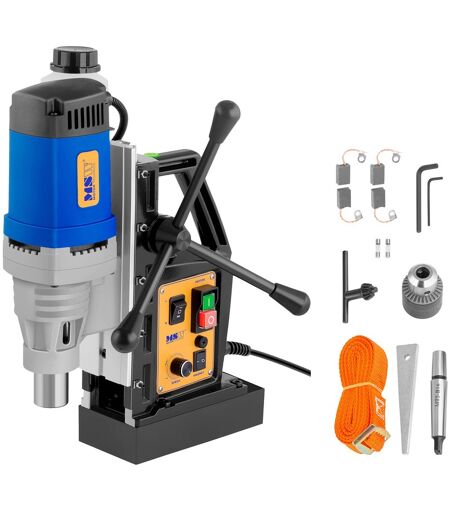 Con un consumo energetico di 1.680 watt, la carotatrice magnetica MSW è una vera potenza quando si tratta di lavorare su una superficie magnetica. Non importa se devi lavorare verticalmente o orizzontalmente. Il potente piedino elettromagnetico mantiene la macchina in sicurezza e nella posizione desiderata. Il trapano magnetico offre servizi affidabili, preziosi nel settore industriale così come nella lavorazione del metallo industriale. La macchina è adatta a foratura, svasatura e filettatura. Una cosa conta nella lavorazione del metallo: la potenza. Con un consumo energetico di 1.680 watt, la perforatrice magnetica MSW senza dubbio attira l'attenzione. La velocità infinitamente variabile fino a 370 giri al minuto consente la perforazione così come la svasatura, la foratura e la carotatura. Durante la filettatura, entra in gioco l'inversione del senso di rotazione dell'unità. Impedisce in modo affidabile che il filo appena tagliato venga danneggiato quando si svita il maschio per filettare. La costruzione dell'utensile elettrico consente una semplice precisione di lavoro. La profondità di foratura da 0 a 165 mm può essere regolata con un controllo rotativo a tre bracci. Tenete sempre in vista un orientamento uniforme con la livella a bolla integrata, in modo da riuscire a lavorare perfettamente angoli di 90° . Ultimo ma non meno importante: l'elevata praticità grazie al serbatoio del refrigerante integrato. Per compiti semplici, il serbatoio da 300 millilitri può essere riempito con acqua del rubinetto. Se sono richiesti lavori impegnativi, viene utilizzato un refrigerante speciale o un olio da taglio. Questo permette di prolungare la vita del trapano e riduce al minimo la manutenzione. Con un peso di circa 20 kg questa carotatrice magnetica ha una massa sufficiente per permettere di lavorare con precisione. Allo stesso tempo, non è così pesate da non poter essere manovrata facilmente. Il disegno compatto ed il cavo di 2 m rendono la macchina forte e adatta a lavori su ponticelli, gru, navi e su tutti gli altri luoghi in cui è necessaria la lavorazione di metalli. Potenziali applicazioni: aree industriali, settore metalmeccanico, officine. Oltre alla grande efficienza, la carotatrice magnetica assicura un lavoro estremamente sicuro. Con una forza massima attrattiva di 13.800 Newton, equivalente a una massa di oltre una tonnellata, il magnete consente anche di lavorare su pezzi più sottili, che possono essere eseguiti solo con un'attrazione davvero elevata. Una sicurezza aggiuntiva è fornita dalla cinghia di ancoraggio inclusa nella fornitura, che previene in modo affidabile danni all'unità e lesioni all'utente, ad esempio in caso di interruzione di corrente. Un'altra importante caratteristica di sicurezza è l'interruttore magnetico RCD. Se il convertitore viene accidentalmente acceso dopo un'interruzione di corrente o una disconnessione dalla rete, il motore non si aziona in ogni caso. Solo se l'interruttore magnetico è attivo, è possibile... ...