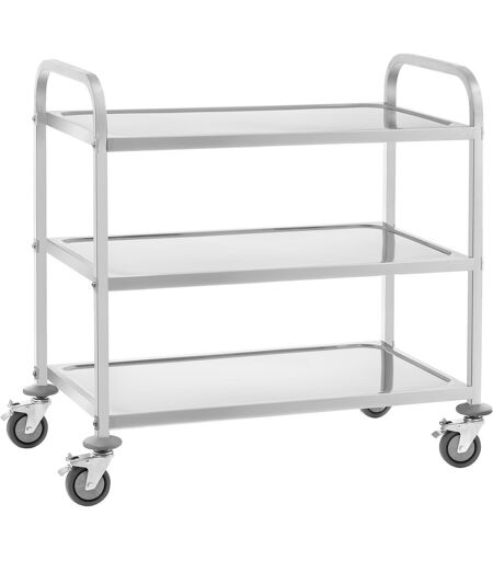 Il carrello portavassoi RCSW 3A della Royal Catering con tre stabili ripiani, grazie alla sua robusta fattura è un must per mense, ristoranti, istituzioni pubbliche e cucine private. Con questo carrello potrete servire pietanze e bevande o trasportare piatti e bicchieri dopo aver sparecchiato. Il carrello in acciaio inox è estremamente robusto e facile da pulire. Il carrello da cucina è realizzato in acciaio inox di alta qualità, il quale non solo garantisce un'alta resistenza ad agenti esterni fisici e chimici, ma anche che il carrello mantenga negli anni un aspetto brillante. La superficie liscia e a pori fini assicura un'igiene duratura. Grazie all'accurata lavorazione, i nostri carrelli sono molto durevoli e resistenti. I tre ripiani offrono un'ampia superficie sulla quale potrete posizionare cibi e bevande per presentarle al meglio e servirle ai vostri numerosi ospiti, ma anche riporre piatti e posate a fine pasto. I ripiani sono facilmente accessibili da tutti e quattro i lati e rivestiti in acciaio inox su ogni spigolo, in modo da rendere l'intera costruzione ancora più stabile. A proteggere le pietanze da scivolamenti involontari è infine presente un bordo protettivo lungo tutto il vassoio. Tra i vassoi c'è una distanza di 28,3 cm, che vi permette di posizionare anche pentole e altri oggetti più grandi. Ciascun vassoio può sopportare un peso di 50 kg senza problemi. Da fermo, il carrello di servizio raggiunge una portata massima statica di 500 kg. Grazie all'elevata capacità di carico e all'ampia superficie di stivaggio, il carrello da cucina evita corse inutili e facilita il lavoro nella vostra azienda. I carrelli convincono per la loro speciale struttura anti-shock. Le vibrazioni e i rumori del carrello vengono infatti assorbiti dai tappetini in gomma antivibranti posizionati sulla parte inferiore. Grazie alle caratteristiche delle ruote, il carrello può essere utilizzato su qualsiasi tipo di pavimento, come piastrelle in ceramica, di legno o parquet. Questo garantisce un funzionamento confortevole, sicuro e silenzioso. Il carrello portavivande è dotato di quattro ruote di grandi dimensioni facili da gestire con quattro freni di stazionamento. Rivestite di gomma termoplastica, rendono possibile lo spostamento silenzioso del carrello anche a pieno carico. Possono essere inoltre ruotate di 360 gradi, in modo che il carrello possa essere spinto senza sforzo anche negli spazi più angusti. Grazie ai quattro tappini protettivi, potrete finalmente dire addio ai danni alle pareti o alle gambe del tavolo. Il profilo quadrato del telaio è profilato sulle maniglie per garantire una tenuta ottimale durante la spinta. Questo lo rende più facile da manovrare anche nei corridoi più stretti. Anche il montaggio risulta estremamente semplice grazie alla struttura del carrello. Il materiale di montaggio necessario è incluso nella fornitura. Scegliete oggi stesso il carrello di servizio RCSW 3A di Royal Catering! ...
