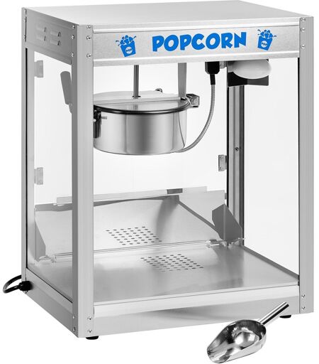 Con la macchina per popcorn di Royal Catering produci fino a 5 kg o 16 litri di popcorn all'ora. La macchina è dotata di un potentia da 1350 W, di un termostato automatico e di un elemento riscaldante di prima classe che raggiunge rapidamente la temperatura di esercizio. In soli 2 minuti dall'avvio della macchina per popcorn potrai servire la prima porzione. Una volta pronti, i popcorn rimarranno freschi e croccanti a lungo grazie alla funzione di mantenimento del caldo. Grazie all'illuminazione integrata e all'alloggiamento in acciaio inox, potrai presentare la tua macchina in modo suggestivo e attraente. Avviare la macchina per popcorn è estremamente semplice: collega il cavo di alimentazione lungo 1,3 m alla rete elettrica. Sopra le porte sono presenti tre interruttori a levetta: HEAT attiva il processo di riscaldamento. Per non bruciare i chicchi sul fondo della pentola durante la produzione, è sufficiente premere il tasto STIRRER, con cui si attiva il sistema di mescolamento. Inoltre, il rivestimento antiaderente della pentola impedisce ai popcorn di attaccarsi. L'interruttore WARMING & LIGHT permette di accendere la retroilluminazione e riscaldare la camera. La spedizione include una pratica paletta per porzionare i pop corn già pronti. La macchina per popcorn è dotata di una struttura di alta qualità abbinata a materiali resistenti per un uso prolungato. L'alloggiamento in acciaio inox è altrettanto resistente quanto i pannelli in vetro temperato. L'aletta di servizio aiuta a rimuovere i pop corn e creare le porzioni, mentre i fori nel piatto inferiore assicurano che i chicchi non tostati o l'olio in eccesso finiscano nel vassoio sottostante. Il vassoio e la pentola possono essere rimossi per una facile pulizia. ...