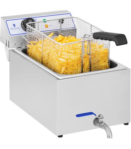 Con la friggitrice di Royal Catering, la tua cucina sarà perfettamente attrezzata. Con una capacità di 17 L e una potenza di 3000 W, questo apparecchio da cucina professionale è ideale in ristoranti, bar o foodtruck. La friggitrice elettrica in acciaio inox di alta qualità è resistente alla ruggine, estremamente durevole e ideale per la lavorazione degli alimenti grazie al suo gusto neutro. Le superfici lisce sono facili da pulire. Il contenitore da 17 L della friggitrice può contenere fino a 11 litri di olio e questo consente di friggere rapidamente grandi quantità di patatine, ali di pollo, anelli di cipolla o gamberetti in un unico processo. Ma nel contenitore allungato puoi cucinare comodamente anche il pesce. Grazie all'intervallo di temperatura regolabile da 60 a 200 °C e al termostato a risparmio energetico, preparerai qualsiasi fritto alla perfezione. Le spie luminose indicano quando il dispositivo si riscalda oppure quando l'olio ha raggiunto la temperatura ottimale per iniziare a friggere. Grazie a una potenza di 3000 W, l'olio della friggitrice raggiunge la temperatura desiderata con estrema rapidità. La zona fredda integrata garantisce che i cibi avanzati dalla frittura non si brucino. Nella creazione di questa friggitrice elettrica è stata posta particolare attenzione alla sicurezza. Il dispositivo si spegne automaticamente quando l'elemento riscaldante non si trova nella posizione corretta. Il termofusibile protegge in modo affidabile la friggitrice dal surriscaldamento e l'impugnatura cool-touch del cestello protegge dalle scottature. Inoltre, quattro piedini in gomma garantiscono un posizionamento sicuro e proteggono la superficie della cucina dai graffi. Un altro punto a favore è il rubinetto di scarico, che consente di scaricare l'olio usato in modo rapido e controllato. Infine, la spedizione include anche un coperchio che protegge da sporco e impurità. ...