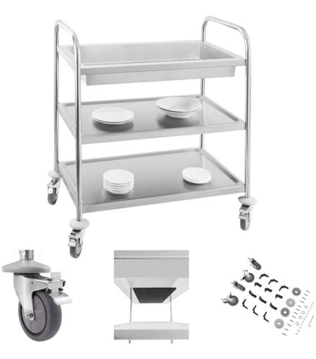 Codice produttore: 10010354 Il carrello portavivande Royal Catering è perfetto per ristoranti, fast food, bar, pizzerie, mense e altre attività di ristorazione che richiedono attrezzature pratiche e robuste. L'acciaio inossidabile utilizzato in questo modello è caratterizzato da una superficie molto liscia con porosità minima. Grazie a ciò, il carrello è facile da pulire, ad esempio con un panno umido. Questo tipo di acciaio ha anche una maggiore resistenza alla corrosione e ai danni meccanici. I ripiani resistenti del carrello sono progettati per resistere a carichi pesanti. La loro capacità di carico statico combinata è di 500 kg. Il ripiano superiore profondo è ideale per trasportare in sicurezza oggetti alti come bottiglie, brocche, bicchieri, ecc. I due ripiani piatti hanno i lati rialzati per evitare che gli oggetti scivolino. La distanza tra i ripiani è di 26,5 e 27,5 cm. Inoltre, la parte inferiore di ogni ripiano è dotata di tappetini antivibranti per smorzare vibrazioni e ...