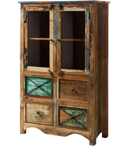 Vetrina che cattura tutti gli sguardi: questo mobile dall'aspetto vintage cattura gli sguardi di tutti. In soggiorno, in cucina o in corridoio: questa vetrina porta allegria direttamente nelle vostre quattro mura. Ogni mobile è un esemplare unico realizzato in legno massiccio antico con residui di colore, unico nella sua forma e struttura. In combinazione con il legno di mango e di acacia, dalle venature particolari, la vetrina colorata conferisce a ogni ambiente quel qualcosa in più. I dettagli incrociati sui cassetti e le maniglie a pomello in metallo sono elementi di design. Inoltre, anche l'interno della credenza in legno massiccio in look vintage mantiene la sua promessa: gli accessori decorativi sono messi in bella mostra dietro le due ante in vetro. Altri oggetti possono essere riposti al riparo dalla vista nei quattro cassetti colorati della vetrina. ...