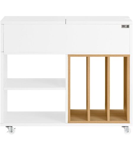 Elegante tavolino su ruote: un tavolino semplice e moderno che attira l'attenzione in ogni ambiente. Sia come ripiano per laptop, riviste o bevande, il tavolino stabile brilla per l'aspetto e la funzionalità. Nel 1 cassetto e 1 piccola porta posteriore si possono riporre tutti gli oggetti personali che devono rimanere nascosti agli occhi indiscreti. 2 scomparti offrono spazio ideale per altri piccoli oggetti. Ha un ripiano per libri in colore naturale, che può anche essere rimosso. Utilizzare la piastra per stampanti, libri, foto, oggetti decorativi, ecc. Grazie alle sue 4 ruote, questo carrello può essere spostato facilmente. È quindi possibile arrotolare facilmente questo carrello multifunzione in ufficio, in salotto o nello studio o fissarlo con i 2 freni, se necessario. Le superfici lisce e luminose sono facili da pulire e creano un ambiente amichevole. Con una struttura ben lavorata, questo elegante comodino non oscilla e garantirà la durata e la robustezza. Dettagli prodotto: ...