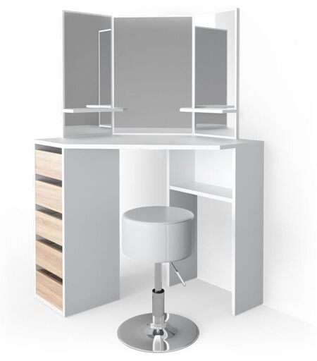 Vicco Tavolo da trucco ad angolo Arielle, Bianco/Sonoma, 110 cm con sgabello