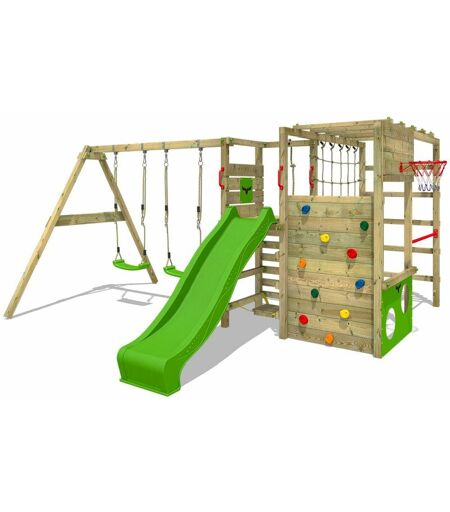 fatmoose Parco giochi in legno ActionArena Giochi da giardino con altalena e scivolo Scala svedese, Barre di scimmia, Struttura da gioco con parete