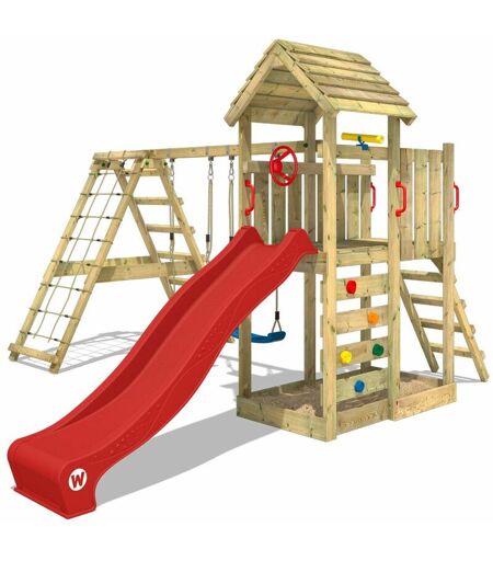 wickey Parco giochi in legno RocketFlyer Giochi da giardino con altalena e scivolo rosso Torre d'arrampicata da esterno con sabbiera e scala di risalita per