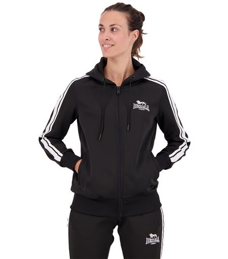 Tuta da donna con cappuccio Tuta monocolore con bande rigate cucite sui fianchi e loghi ricamati in contrasto di colore. Ci sono tasche con zip sulla giacca e sui pantaloni con cappuccio. I polsini sono tutti realizzati in materiale a costine elastiche.Specifiche:- Qualità: 95% poliestere, 5% elastan- Tessuto: Interlock ...