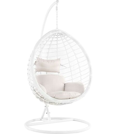 Poltrona sospesa in rattan bianco. Perfetta per rilassarsi, leggere o fare un pisolino pomeridiano, questa sedia a uovo è la scelta ideale per ogni interno domestico. Corredata da un supporto in acciaio arcuato e un'ampia seduta con cuscini, col suo delicato movimento porta invita alla tranquillità. Il suo prezioso motivo decorativo intagliato nel rattan la rende perfetta per ogni stile d'interni, dal moderno, al costiero, fino al boho. Dettagli: Tipo di prodotto: Sedia sospesa Stile: Retrò Colore principale: Bianco Tonalità: Bianco sporco Tipo di materiale: Rattan sintetico Materiale principale: Rattan sintetico Materiale secondario: Acciaio Materiale delle gambe: Metallo Materiale della seduta: Tessuto Composizione del materiale: 100% Poliestere Finitura: Trattamento a polvere Densità della seduta: 22 kg/m3 Dimensioni: Dimensioni della base: 106x106 Profondità: 108 cm Spessore della seduta: 15 cm Altezza della seduta: 50 cm Larghezza: 108 cm Altezza: 200 cm Dimensioni seduta: 60x45 ...