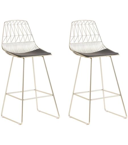 Set di 2 moderni sgabelli da bar in acciaio dallo stile moderno. Dona tocco speciale con queste sedie alte dallo schienale curvato. Realizzate in solido metallo verniciato, presentano cuscini in pelle sintetica e piedini antiscivolo, per la massima stabilità. Queste sedie dal design originale sono eccezionali non solo per stile e altezza ma anche per praticità e comfort, assicurati dal poggiapiedi integrato; perfette per essere utilizzate in cucina così come in un bar dal look moderno. Dettagli: Tipo di prodotto: Sgabello da bar Stile: Moderno Colore principale: Oro, Nero Colore della struttura: Oro Tipo di materiale: Metallo Materiale principale: Acciaio Materiale secondario: Pelle sintetica Materiale delle gambe: Metallo Materiale della seduta: Ecopelle Composizione del materiale: 100% pelle sintetica Poggiabraccia: No Finitura: Trattamento a polvere Impilabile: No Dimensioni: Profondità: 55 cm Altezza della seduta: 74 cm Larghezza: 50 cm Altezza: 111 cm Dimensioni seduta: 46x37 cm ...
