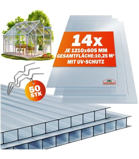 GARDEBRUK - 14x lastre alveolari policarbonato 50x clip acciaio inox 4mm 10,25 m² pannelli serra doppia parete 1210x605