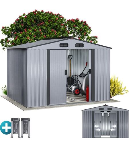 Metti ordine nel tuo giardino! Gli attrezzi da giardino sono al sicuro nella casetta per attrezzi in metallo GARDEBRUK® XXL con base . La casetta da esterno è dotata di una porta scorrevole a due ante per un facile accesso e di 4 aperture di ventilazione nella parte superiore, 2 nella parte anteriore e 2 nella parte posteriore. Le maniglie della porta sono predisposte per inserire un lucchetto (non incluso). Il capannone per attrezzi viene fornito con un battiscopa. Gli angoli del tetto in metallo sono dotati di protezione per gli spigoli. La base garantisce un appoggio sicuro e consente di installare un pavimento (non incluso). La consegna comprende 4 ganci per appendere pale, rastrelli e forbici da potatura fino a 15 kg. Vantaggi del prodotto: Lamiera d'acciaio zincata su tutto il perimetro Superficie di circa 5m² circa 9m³ di volume 4 aperture di ventilazione (2x anteriore/2x posteriore) Base con struttura zincata Resistente alle intemperie Stabile Dati tecnici: Superficie interna ...