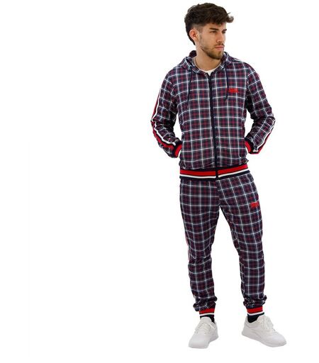 Tuta da uomo con cappuccio slim fit.Descrizione del modello: tuta composta da giacca e pantaloni.Entrambi i capi hanno una piccola applicazione del logo rispettivamente sul petto e sulla gamba sinistra dei pantaloni, oltre a strisce a contrasto su spalle, maniche e gambe dei pantaloni.La giacca è dotata di cappuccio e due tasche con cerniera.Le tasche dei pantaloni possono anche essere chiuse con una cerniera lampo. ...