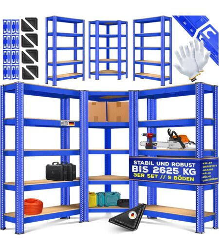 MASKO Set di 3 Scaffalature metalliche , 1 Ripiano angolare e 2 Ripiani portaoggetti, 15 Ripiani in mdf, portata fino a 2625 kg, Blu -