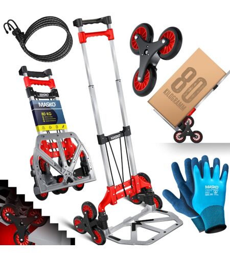MASKO Carrello per sacchi a gradini Carrello per scale Pieghevole 80 kg di portata 3x3 scalatori incl. ruote + 2 corde di espansione + guanti - Maniglia