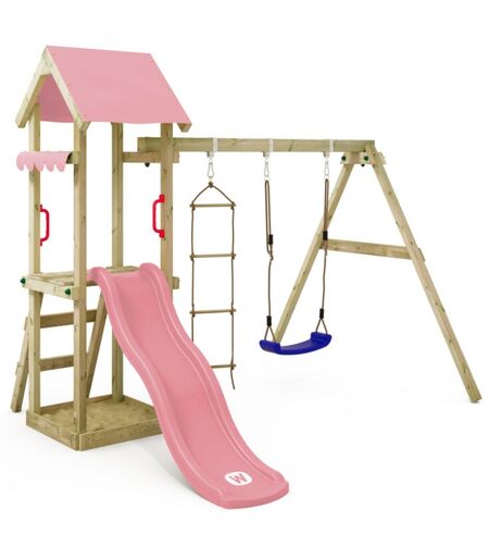 wickey Torre gioco TinyCabin con altalena e scivolo, torre da arrampicata con sabbiera, scala e accessori da gioco - rosa pastello -