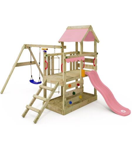 wickey Casetta TurboFlyer con altalena e scivolo, torre da arrampicata con sabbiera, scala e accessori da gioco - rosa pastello -