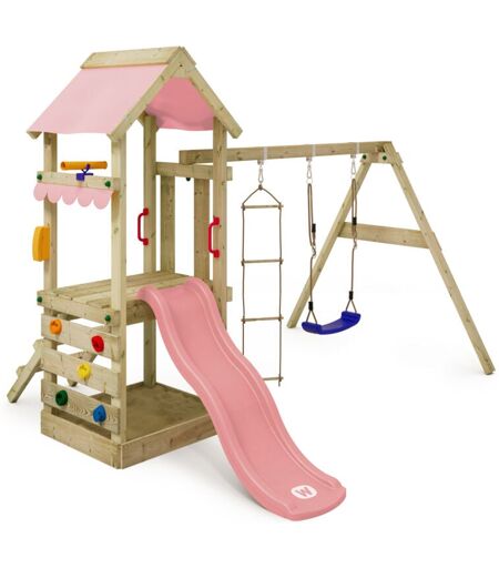 wickey Torre gioco FreshFlyer con altalena e scivolo, casetta su palafitte con sabbiera, scala e accessori da gioco - rosa pastello -