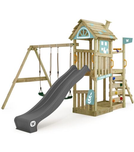 wickey Parco giochi in legno FarmFlyer Tetto in legno Giochi da giardino con altalena e scivolo Casetta da gioco per l'arrampicata con sabbiera e scala di