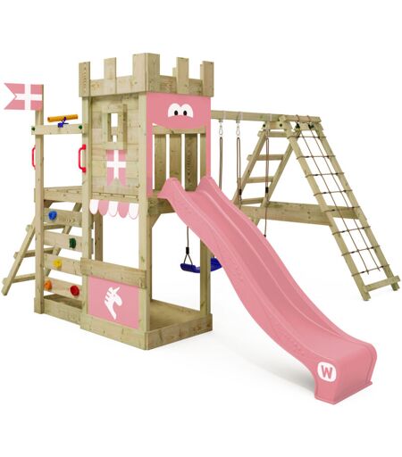 wickey Castello DragonFlyer con altalena e scivolo, casetta da gioco con sabbiera, scala e accessori da gioco - rosa pastello