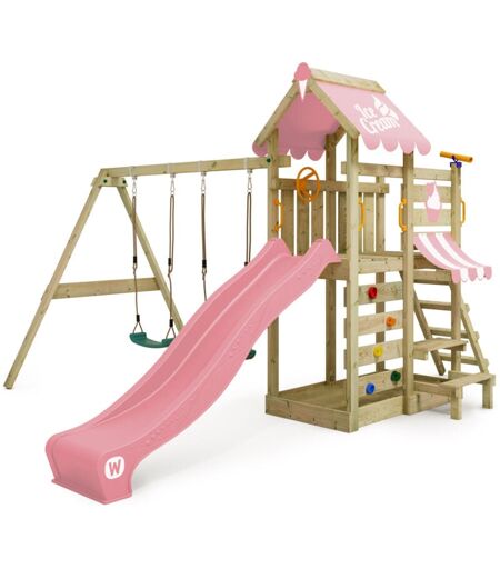 wickey Torre gioco VanillaFlyer con altalena e scivolo, torre da arrampicata con sabbiera, scala e accessori da gioco - rosa pastello -