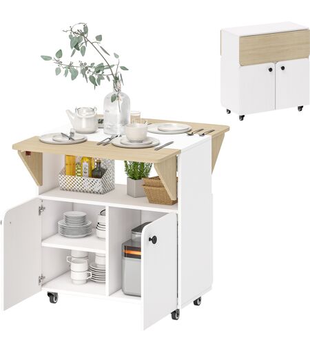 Homcom Mobile Tavolo Pieghevole con Ruote, due piani pieghevoli, Vano portaoggetti, 4 Ruote, Bianco+Naturale, 70 x 83 x 75cm Aosom Italy