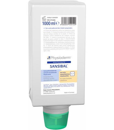 Descrizione Esecuzione: SANSIBAL®. Crema dermoprotettiva a rapido assorbimento per la manipolazione di sostanze da lavoro non idrosolubili. Rischi: oli, grassi, lubrorefrigeranti non mescolabili con acqua. Caratteristiche: crema (emulsione O/A), pH neutro, profumata (con idoneità HACCP), priva di siliconi. Dati tecnici Tipo di prodotto Protezione della pelle Protezione da Sporco intenso Serie Physioderm® Privo di siliconi sì Per distributori 095811 Confezione Flacone Vario Profumata sì pH neutro sì ...