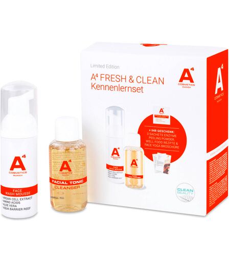 Set di familiarizzazione A4 FRESH & CLEAN: provate l'effetto rivitalizzante e rinfrescante dei prodotti detergenti delicati di A4 Cosmetics. Regalate alla vostra pelle un colorito fresco e naturale! A4 Face Wash Mousse: schiuma detergente delicata e rinfrescante che rimuove delicatamente il trucco e le impurità e aiuta a idratare intensamente la pelle senza danneggiarne l'acidità.idratante senza aggredire il mantello acido protettivo della pelle. La pelle viene pulita in profondità senza seccarsi. Per tutti i tipi di pelle, in particolare per le pelli sensibili e delicate. A4 Facial Tonic Cleanser: il detergente A4 Facial Tonic Cleanser consente una pulizia efficace e semplice che rimuove delicatamente il trucco e le impurità. Allo stesso tempo, fornisce alla pelle un'idratazione duratura, stimola il metabolismo e dona un aspetto fresco. La pelle viene pulita in profondità senza seccarsi. Adatto a tutti i tipi di pelle. A4 Enzyme Peeling Powder: l'A4 Enzyme Peeling Powder dona un colorito uniforme e una sensazione di pelle fresca e morbida. L'esfoliazione rimuove le cellule morte e rigenera la pelle più rapidamente. La pulizia enzimatica ad azione profonda minimizza i pori, uniforma l'incarnato e rende la pelle più ricettiva ai successivi prodotti per la cura della pelle. La pelle appare visibilmente più liscia e uniforme. Il peeling enzimatico è adatto a tutti i tipi di pelle. Contenuto del set: 1 A4 Mousse Lavaggio Viso 50 ml, 1 A4 Tonico Detergente Viso 50 ml + Il nostro regalo: 1 A4 campione di prova Peeling Enzimatico in Polvere, 3 pezzi (1g ciascuno), 1 A4 Ricetta Well Food, 1 A4 Opuscolo Face Yoga Applicazione: Massaggiare manualmente la mousse A4 Face Wash sulla pelle umida al mattino e alla sera, quindi risciacquare accuratamente la schiuma detergente. Aprire la bustina esfoliante e versare la polvere sul palmo della mano. Insaponarla con qualche goccia di acqua tiepida e applicare la schiuma ottenuta su viso, collo e décolleté inumiditi. Quindi massaggiare delicatamente il peeling enzimatico e risciacquare con acqua tiepida. Utilizzare il peeling solo esternamente e non più di 1-2 volte alla settimana. Si consiglia di evitare la zona degli occhi durante l'applicazione. Fare attenzione a non inalare la polvere esfoliante. Applicare il detergente tonico A4 su un dischetto di cotone al mattino e alla sera e passarlo delicatamente sul viso. Non risciacquare il detergente per il viso per consentirgli di sviluppare tutti i suoi effetti. ...