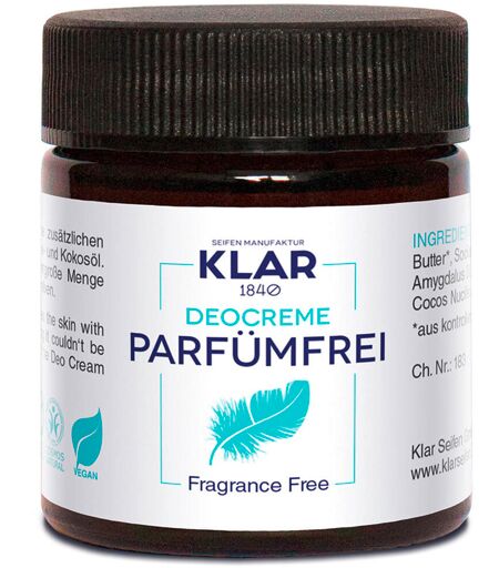La crema deodorante senza profumo di Klar è una protezione pura e affidabile contro i cattivi odori. Gli ingredienti naturali bicarbonato di sodio e zinco riducono la produzione di sudore, mentre il burro di karité, le mandorle e l'olio di cocco si prendono cura della pelle sotto le ascelle. Poiché la crema deodorante non contiene profumi, conservanti, siliconi, sali di alluminio, olio di palma o alcol, è adatta anche alle pelli particolarmente sensibili. senza sali di alluminiosenza profumonaturalmente forte con bicarbonato di sodio e zincodelicato sulla pelle con ingredienti nutrienti ULTERIORI INFORMAZIONI SUL PRODOTTO La nostra pelle ha sempre bisogno di un po' di tempo per abituarsi a un nuovo prodotto. Pertanto, poco dopo il passaggio a una crema deodorante senza alluminio, è possibile che si verifichi un aumento della sudorazione e dei cattivi odori. Tuttavia, questo fenomeno si attenua dopo qualche giorno di utilizzo. La crema deodorante può essere utilizzata direttamente dopo la rasatura. PROFUMO ED EFFETTO Profumo: neutro/senza profumo Effetto: nutriente, previene la sudorazione e gli odori ISTRUZIONI PER L'USO Applicare una quantità di crema deodorante della grandezza di un pisello sotto le ascelle appena lavate e strofinare. La crema deodorante di Klar protegge per tutto il giorno. Conservare la crema deodorante in un luogo fresco. ...
