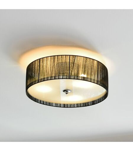 Plafoniera La plafoniera con telaio e paralume cilindrico in tessuto organza traslucido nero è una scelta elegante e funzionale per qualsiasi ambiente. Il design raffinato lo rende perfetto per chi cerca un'illuminazione soffusa ma efficace. Il paralume, alto 12 cm e con un diametro di 40 cm, diffonde la luce in modo uniforme grazie alla sua struttura in tessuto organza, che ammorbidisce l'intensità delle lampadine e crea un'atmosfera accogliente e rilassante. L'utilità di questa lampada è evidente soprattutto in ambienti dove si desidera un'illuminazione generale, ma non troppo invasiva. Il vetro opalino posto nella parte inferiore del paralume aiuta a schermare le lampadine, proteggendo gli occhi dalla luce diretta e permettendo una diffusione morbida e piacevole. Con tre fonti di luce, la plafoniera garantisce una luminosità adeguata per stanze di dimensioni medie e grandi, senza risultare abbagliante. Questa lampada si adatta a diversi stili di arredamento, dal moderno al ...