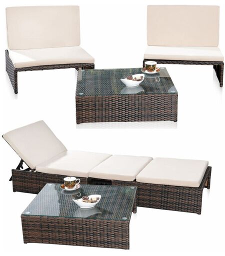 MELKO Set di mobili da giardino versatile lettino da giardino, panca o due sedie con schienale, con tavolo e piano in vetro di sicurezza, in